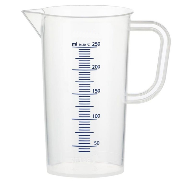 Hochtransparent. Mit gut lesbarer, erhabener, blau geprägter Skala und stabilem, griffigem Henkel. Um die Prägung zu schonen, wird die Reinigung bis max. 60 °C empfohlen.